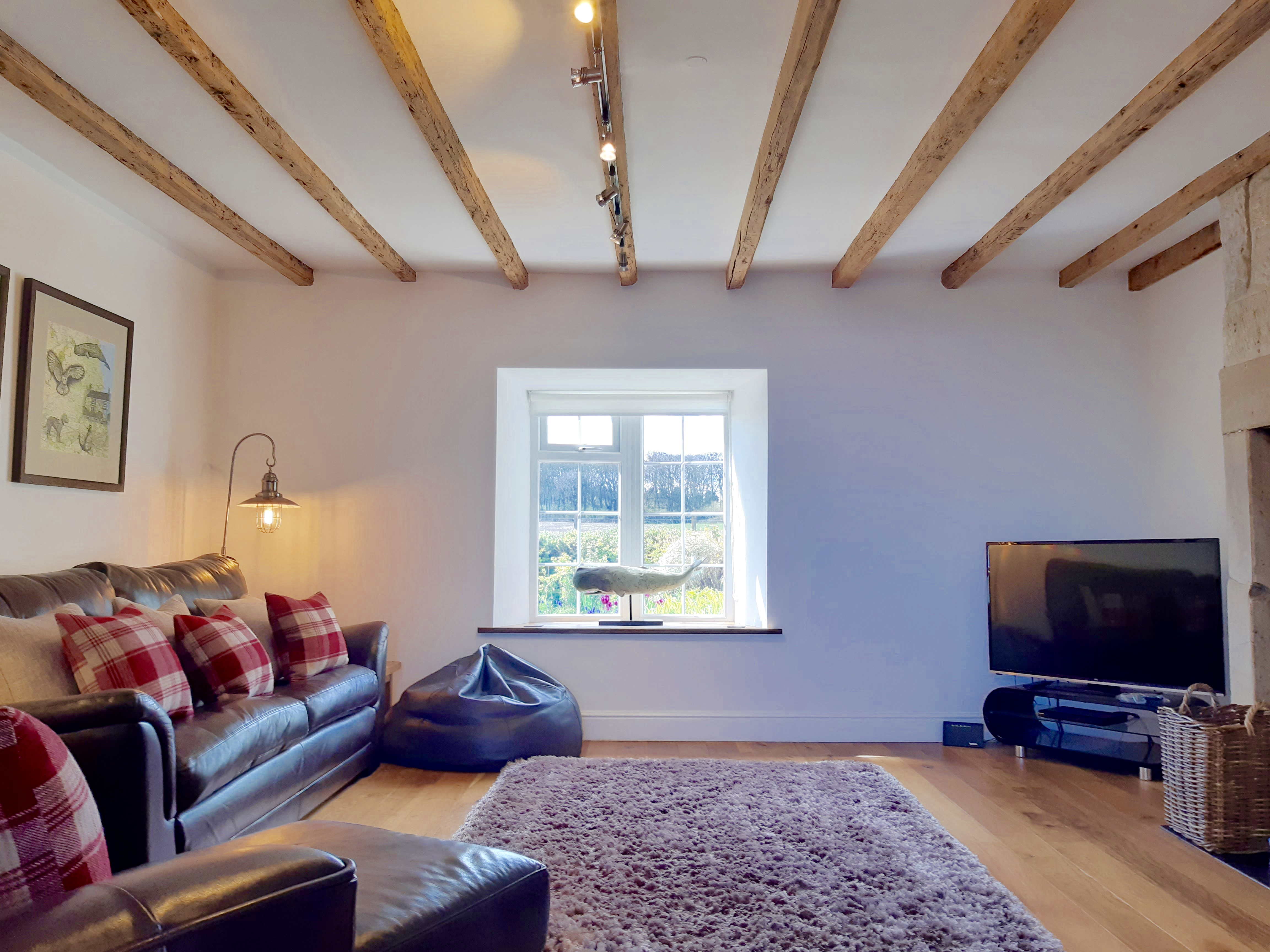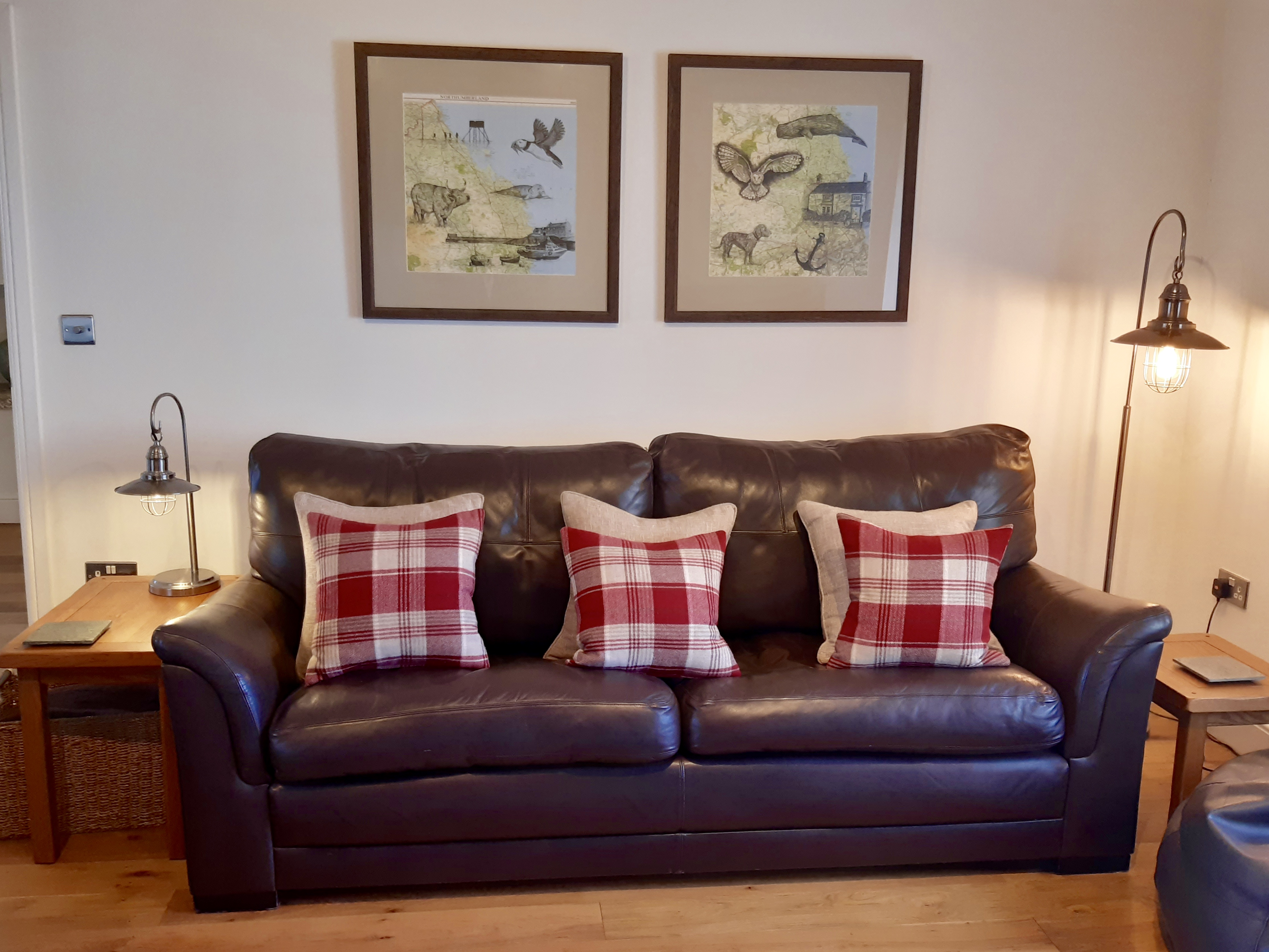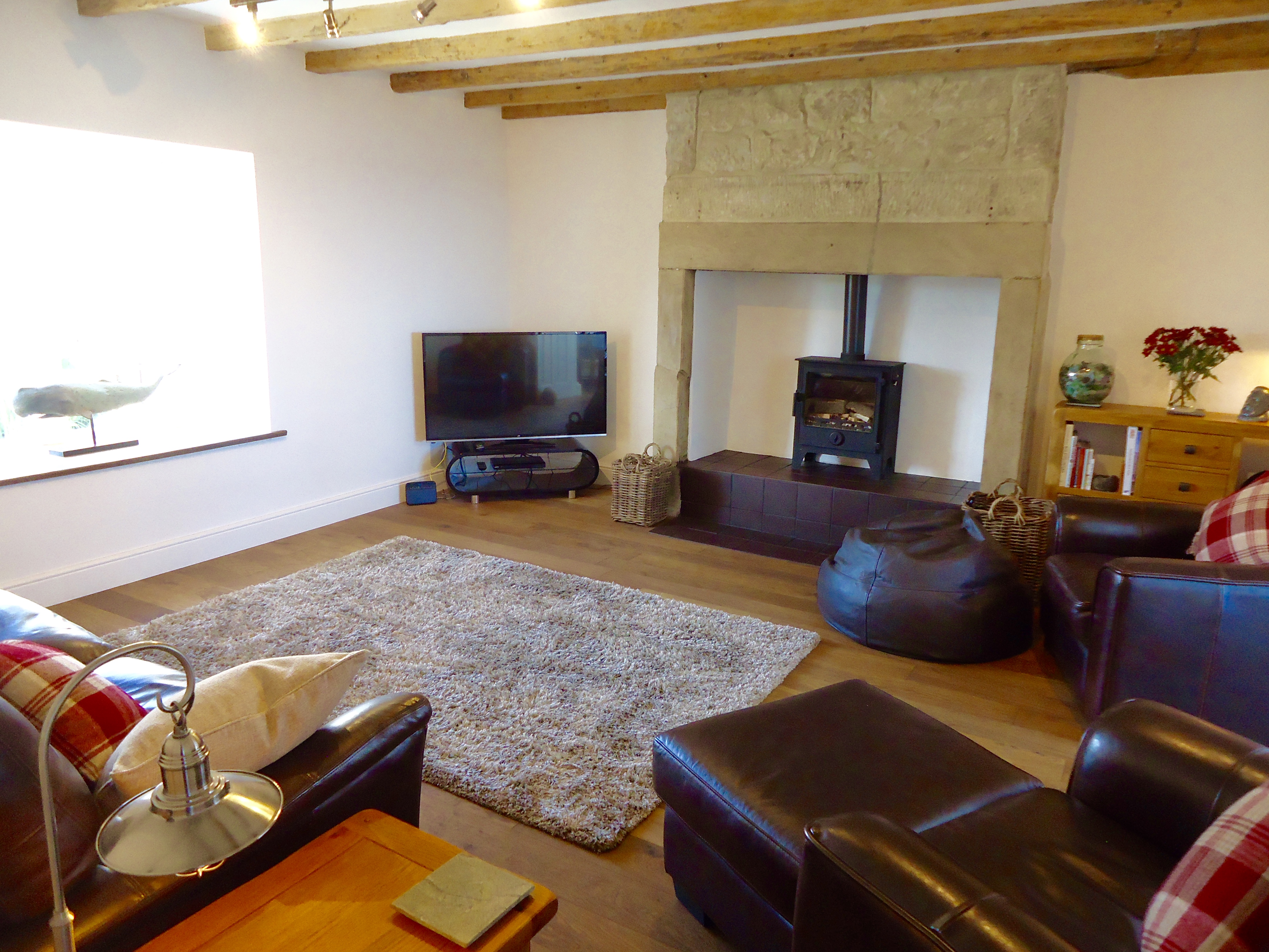 The spacious living room has a large leather sofa and armchairs, a smart TV with DVD, and a log burner for cosy nights in