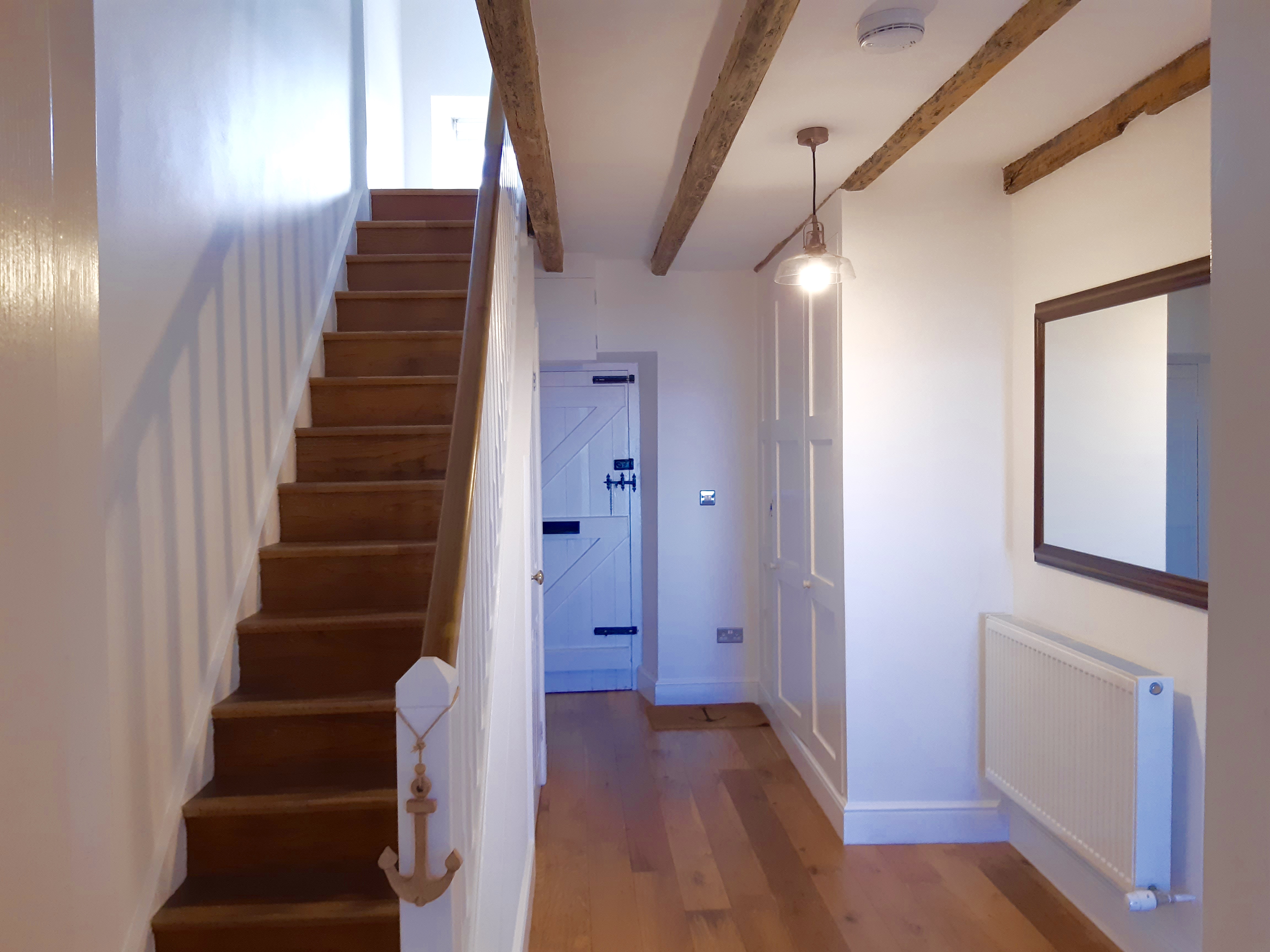 The staircase has a sturdy wooden bannister. The original front door is in the background