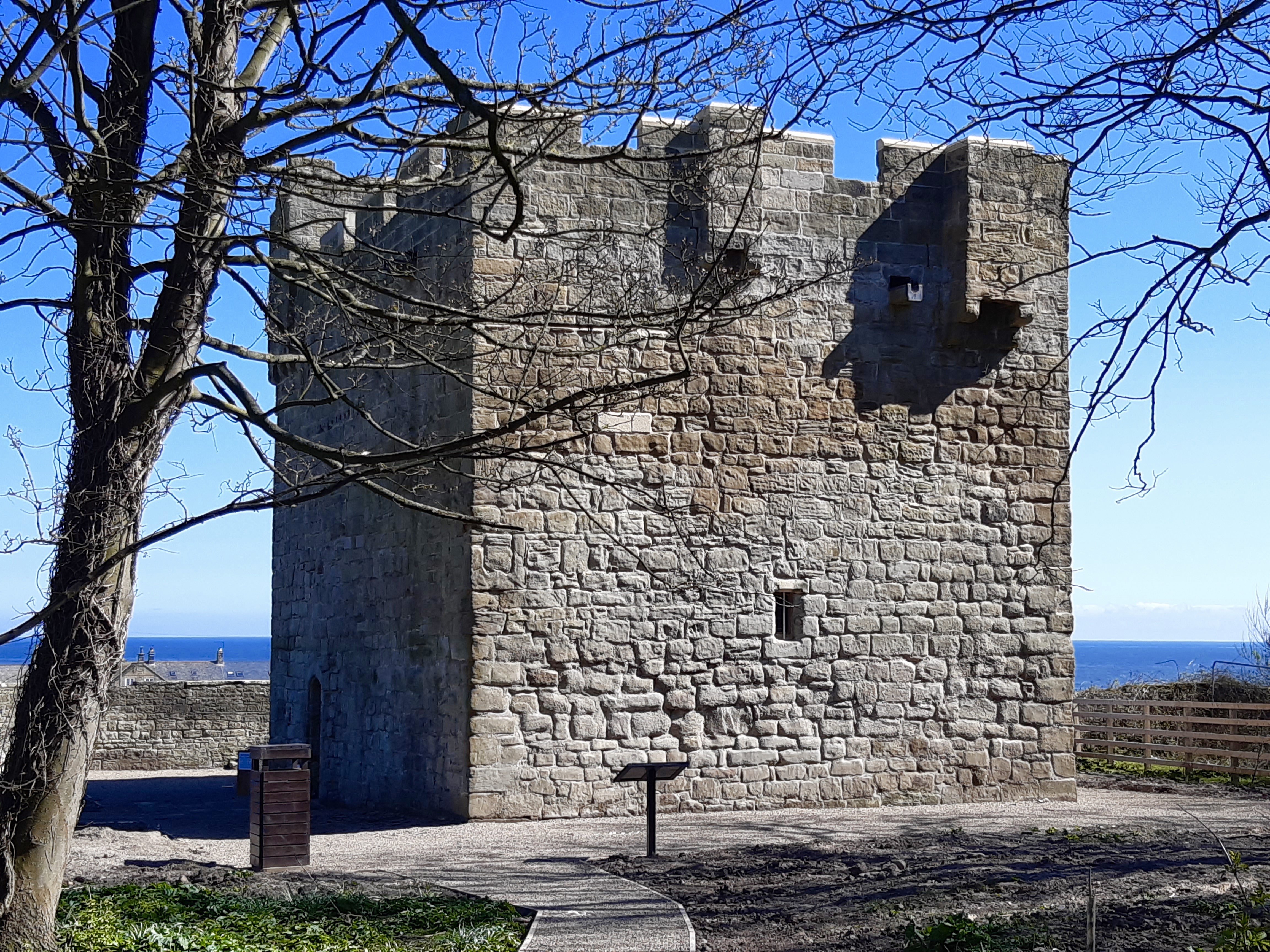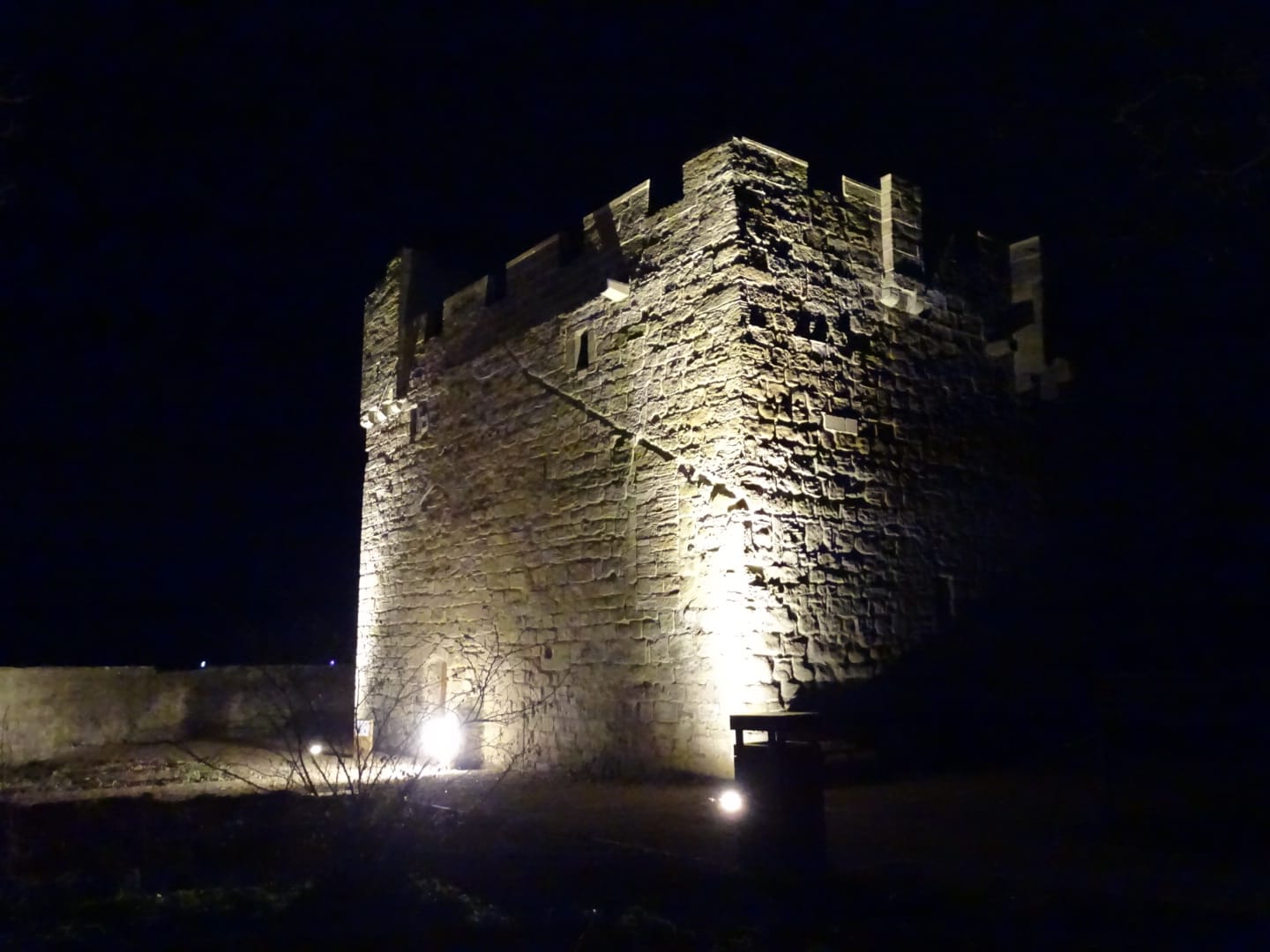 The Pele Tower opposite is illuminated at night, which is very atmospheric