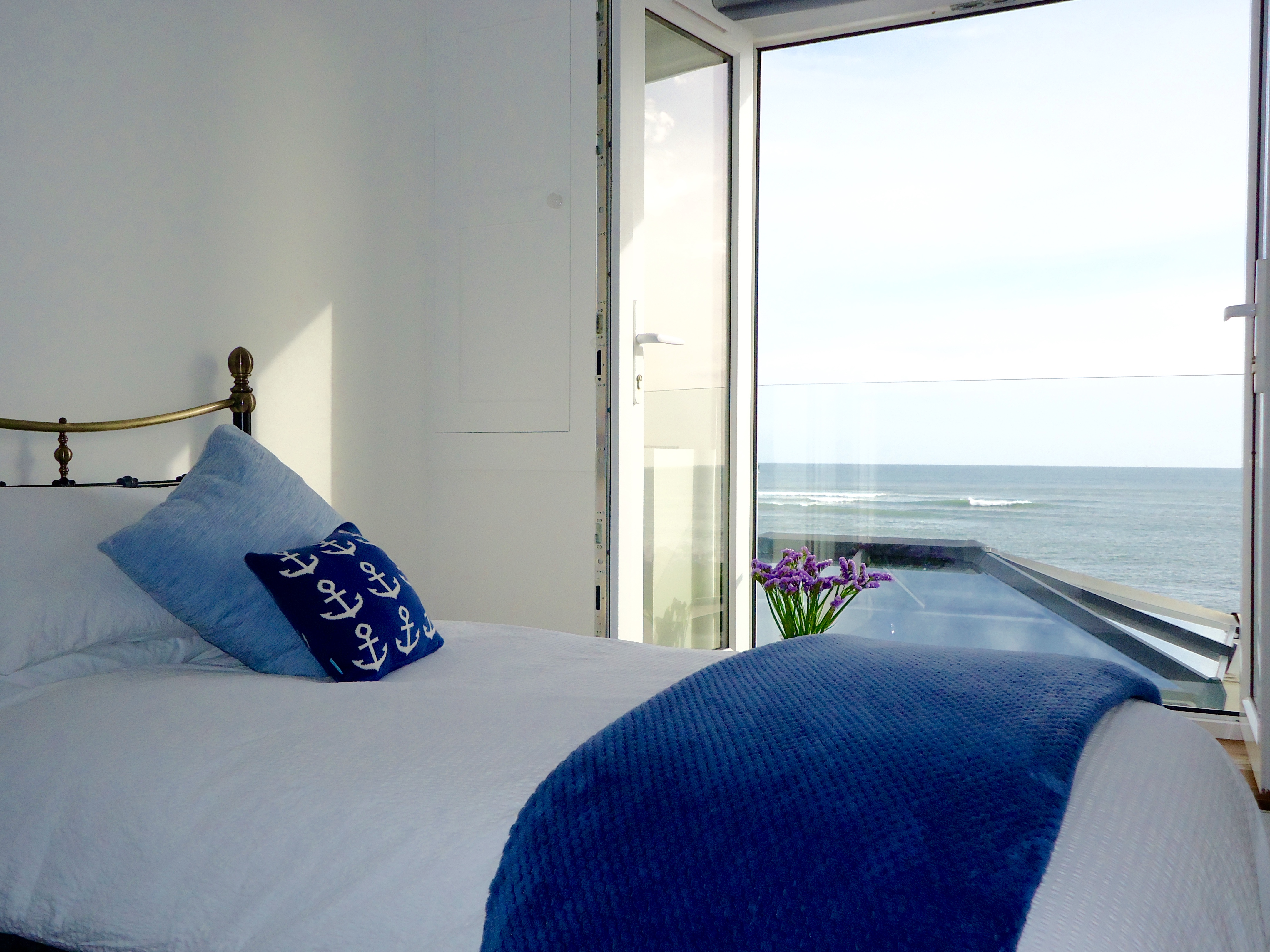 The master bedroom has a king-sized bed and a wall-mounted TV, as well as a stunning panoramic sea view